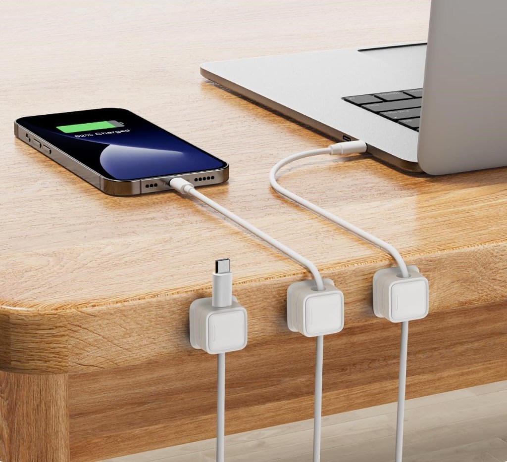 These are perfect for the back/ top of a desk, night stand, side table, etc. No more searching for your cord that fell between the wall and furniture.