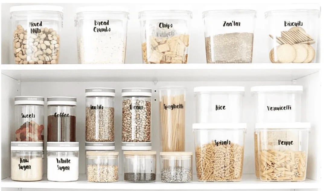 For me, decanting brings me so much joy. I love the look of matching containers instead of the mix-matched boxes they originally came in. I also love pouring everything in. When I get home from the grocery store, I rush to put all of the refrigerated items away, so then I can get to my favorite part, decanting. It is so satisfying to pour the new box of noodles into the cute clear container! I also love taking all of the empty boxes out to the recycling. I love decanting and it works for me and my lifestyle, but it’s not for everyone.